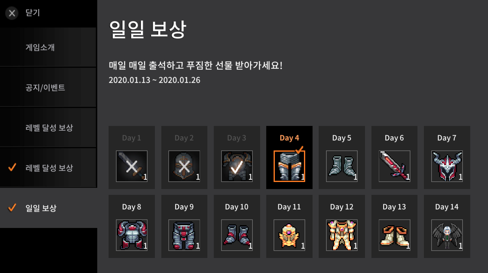 * 누적 접속일 보상 : 이벤트 기간내에 유저가 누적해서 접속한 일수에 따라 보상 수령 가능