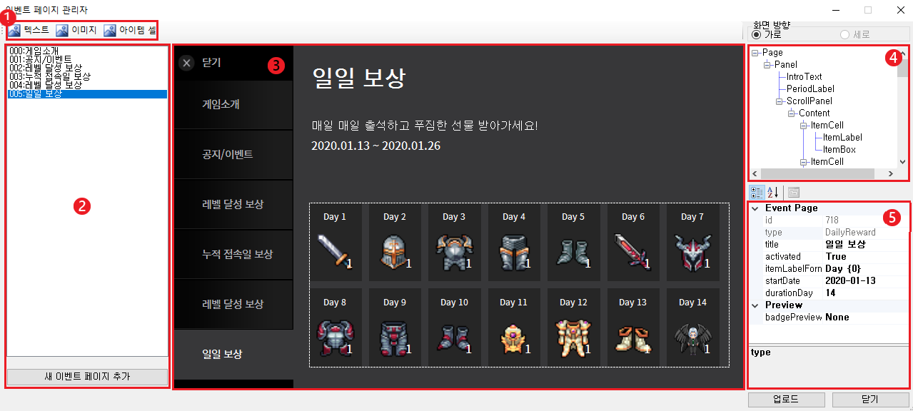 템플릿에 따라 필요한 아이템 셀에 아이템 등록을 완료하게 되면 이벤트 페이지 관리자 우측 하단의 업로드 버튼을 통해 추가한 페이지를 현재 서비스 중인 게임에 바로 적용시킬 수 있습니다.