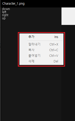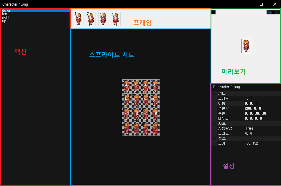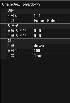 > 해당 스프라이트의 액션(캐릭터의 모션) 및 이미지 세부 설정을 할 수 있습니다.