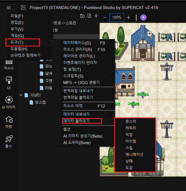 \[데이터 불러오기]를 클릭하여, 몬스터, 캐릭터, 직업, 아이템, 스킬, 애니메이션, 상태, 도감 관련 데이터를 불러올수 있습니다. 아래 스크린샷 참조 바랍니다.