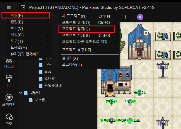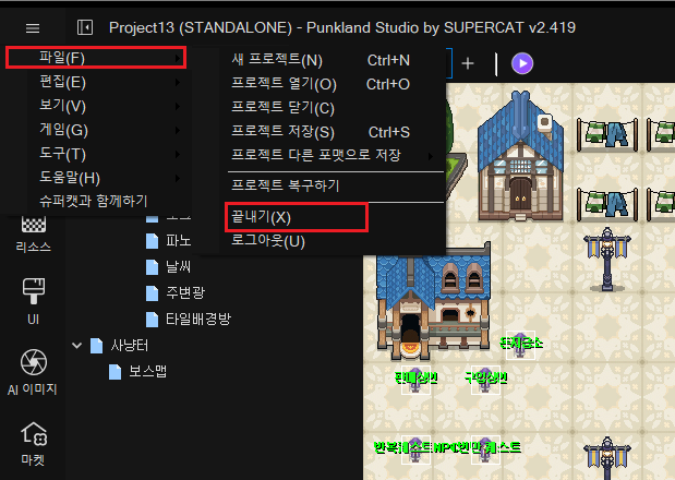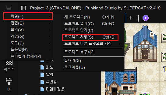 게임 제작 중에 일시 중단할 경우, 편집 중인 프로젝트를 저장하시고, 펑크랜드 스튜디오를 종료해야 합니다. 상단 메인 메뉴 \[파일]을 클릭하고, \[프로젝트 저장]\(혹은 \[프로젝트 저장] 아이콘)을 클릭하면, 편집중인 내용들을 저장 할 수 있습니다.
