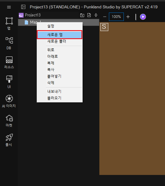 [네코샘플] 폴더를 우클릭합니다. 아래와 같이 [새로운 맵] 팝업 메뉴가 뜨면, [새로운 맵]을 클릭합니다.