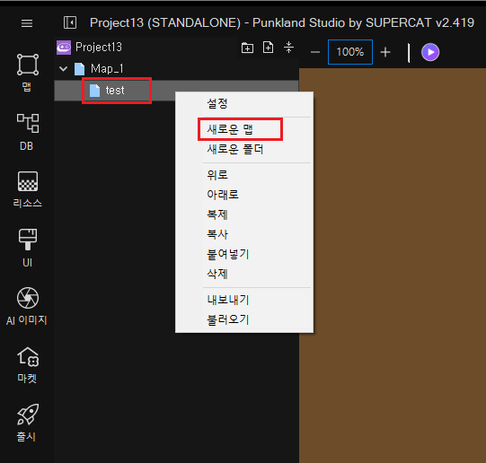 기존맵에서 더 상세하게 편집하기 위하여, 하위 맵을 생성하는 방법은 신규 맵 생성과 같은 방식으로 진행하면 됩니다. 예를들면, \[test]맵에 하위 맵\[test1]을 만들려면, \[test]를 우클릭하여 뜨는 팝업창에서 \[새로운 맵]을 클릭하면,