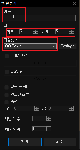 \[맵 만들기] 팝업창이 뜨고, 해당 창에서 \[이름] \[크기] \[타일셋] \[BGM 변경] \[BGS 변경] \[싱글 플레이] \[인스턴스 맵] \[중력] \[채널 개수] \[최대 인원]을 설정하고, \[확인]을 클릭합니다.
