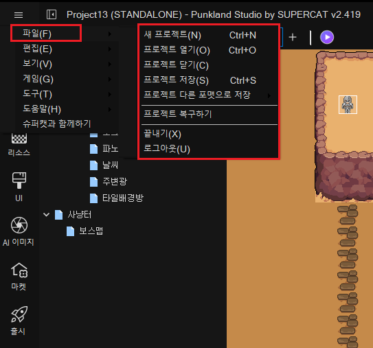 \[파일]탭에는 {새 프로젝트] \[프로젝트 열기] \[프로젝트 닫기] \[프로젝트 저장] \[끝내기] 버튼이 있습니다. 용도에 따라 각 버튼을 클릭하면 됩니다.